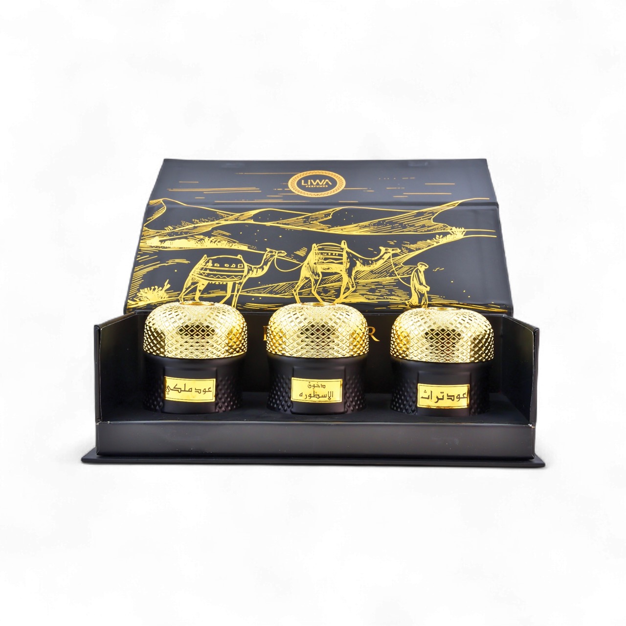 ثلاث عبوات ذهبية مصممة بأناقة تحتوي على أجود خلطات الدخون و العود. مثالية لتعطير الأجواء المنزلية أو كهدايا تقليدية راقية.