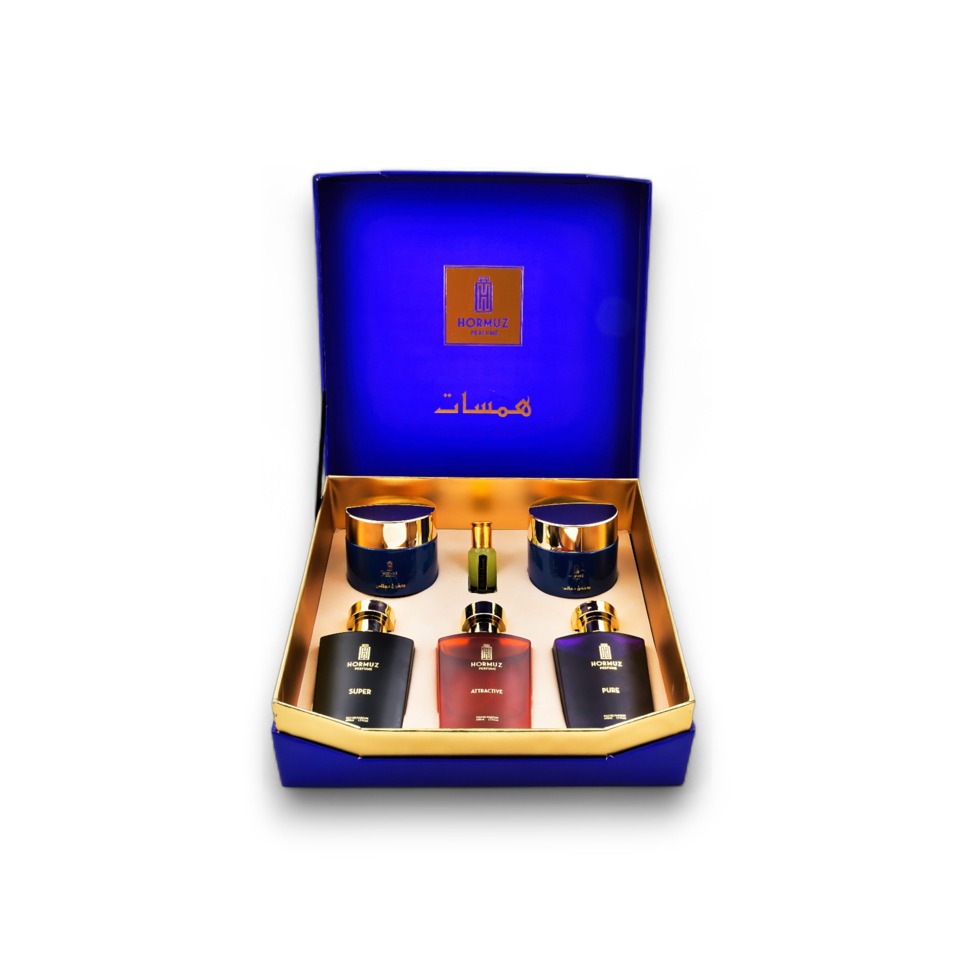 استمتع بسيمفونية من الروائح مع مجموعة همسات من هرمز — تشكيلة فاخرة تجمع بين العطور والكريمات والزيوت لتمنحك تجربة حسية لا تُنسى. تأتي المجموعة في صندوق مميز باللون الأزرق الملكي والذهبي، مما يجعلها الهدية المثالية الفاخرة أو إضافة راقية لروتين عطرك اليومي.